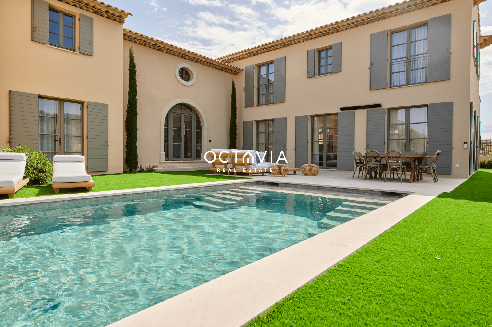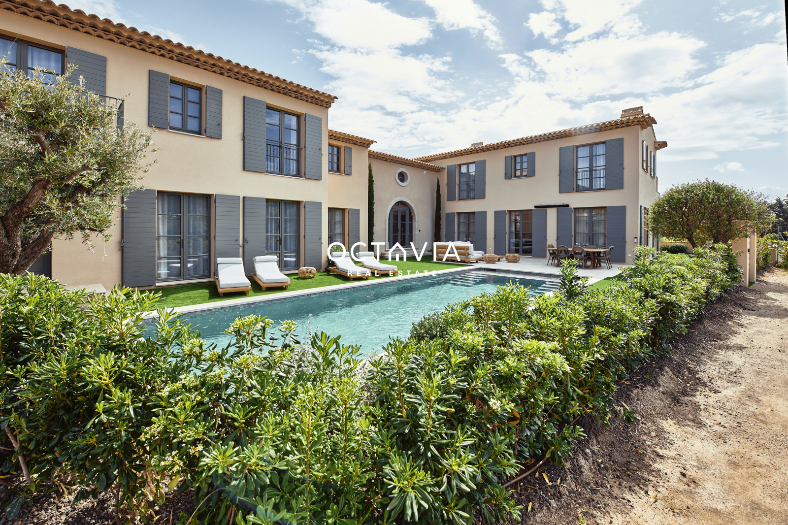Proche de la célèbre Place des Lices, la villa La Belle Isnarde d'une surface de 450 m² se dresse au milieu des vignes et offre une belle vue ouverte sur le village.